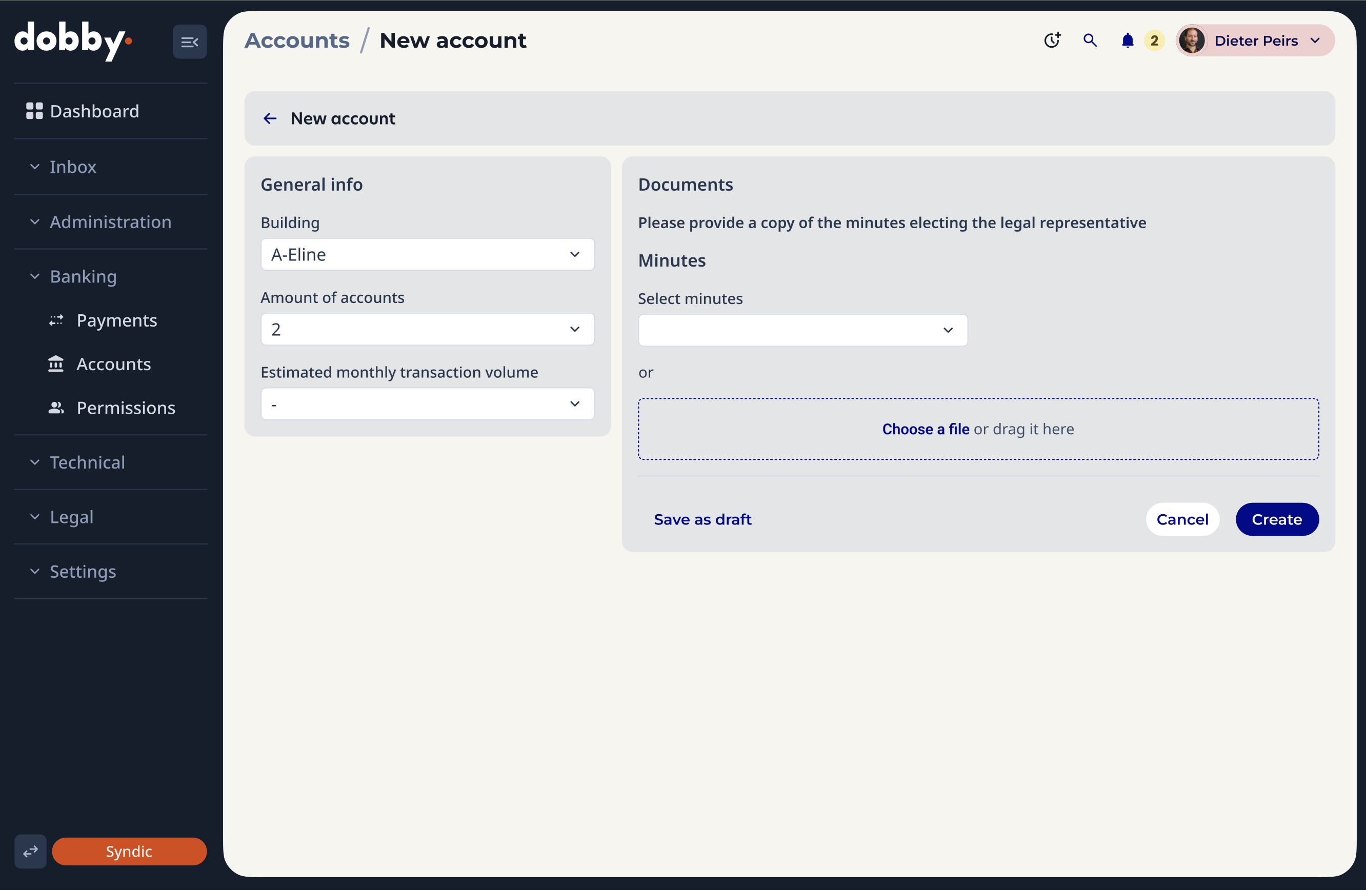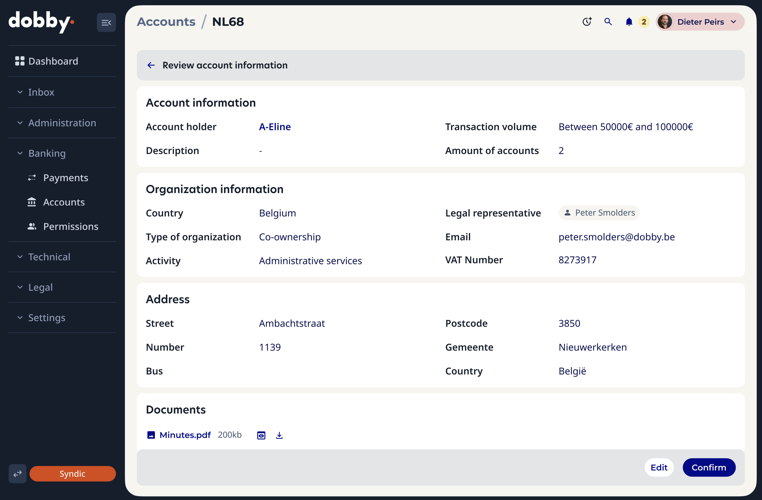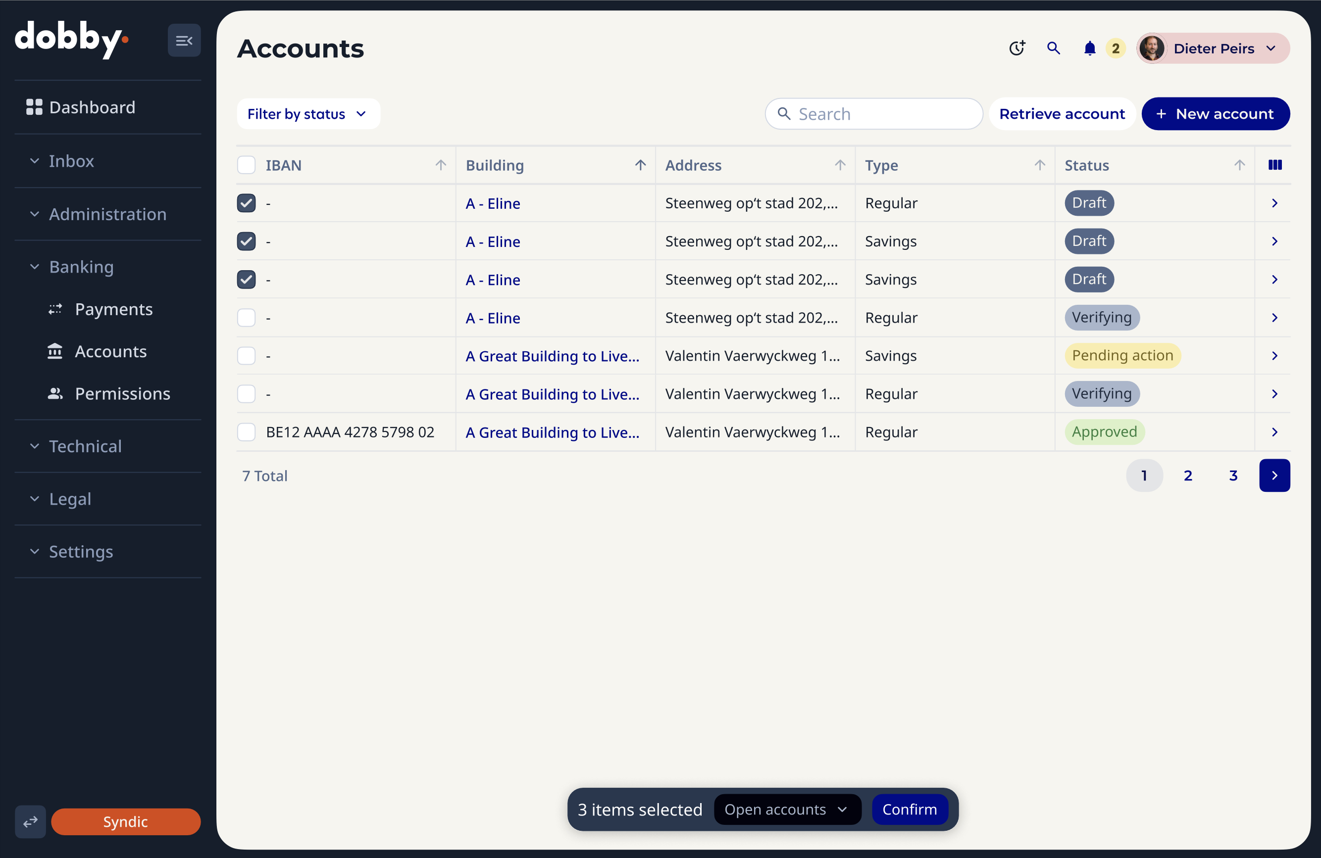 Waar het openen van een rekening voor een nieuw gebouw bij een klassieke bank al snel dagen in beslag neemt en gepaard gaat met flink wat papierwerk, kan dat proces in dobby nu volledig digitaal en binnen enkele uren worden afgerond. In het platform zijn alle transacties, volmachten en rekeninggegevens centraal beschikbaar, waardoor syndici de operationele controle behouden en mede-eigenaars in real time zicht krijgen op de financiële staat van hun gebouw. Transacties kunnen onmiddellijk worden ondertekend, zonder externe software of het manueel verwerken van CODA-bestanden. Het resultaat is een financieel beheer dat merkbaar transparanter en efficiënter wordt.