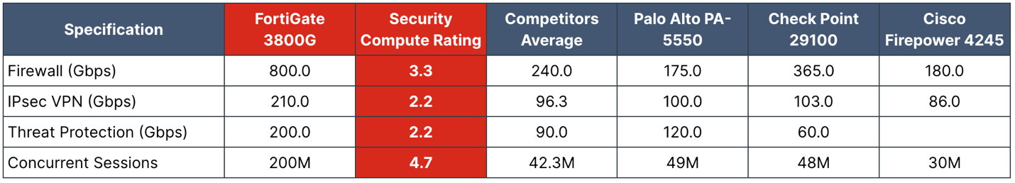 La puissance de la nouvelle série FortiGate 3800G et des services FortiGuard AI Powered est mise en évidence dans les tableaux ci-dessous, qui comparent les meilleurs pare-feux du marché aux performances cibles du FortiGate 3800G.