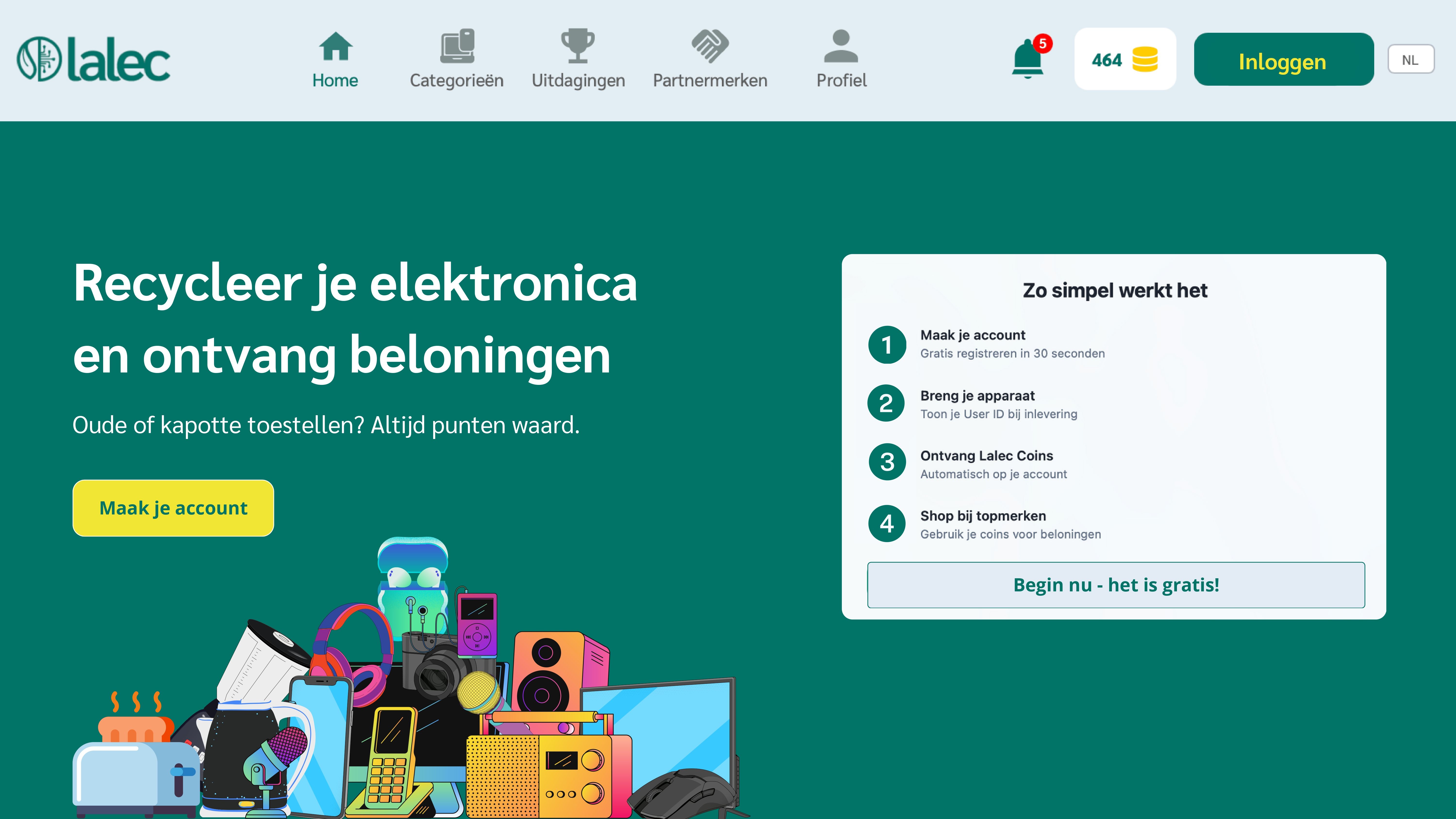 Lalec.be is bijzonder eenvoudig: een account aanmaken en oude, kapotte of ongebruikte elektronische toestellen naar een inzamelpunt brengen, bijvoorbeeld bij deelnemende Kringwinkels. Daar wordt het toestel samen met de gebruikers-ID geregistreerd, waarna onmiddellijk ‘coins’ worden toegevoegd aan het gebruikersprofiel. Deze coins kunnen worden ingeruild voor kortingen bij deelnemende A-merken zoals Samsung, Smeg, Canon en Sony. Daarnaast wordt de beloningsgeschiedenis ook bijgehouden, en weergegeven in leaderboards met de top-recyclers per stad of regio.